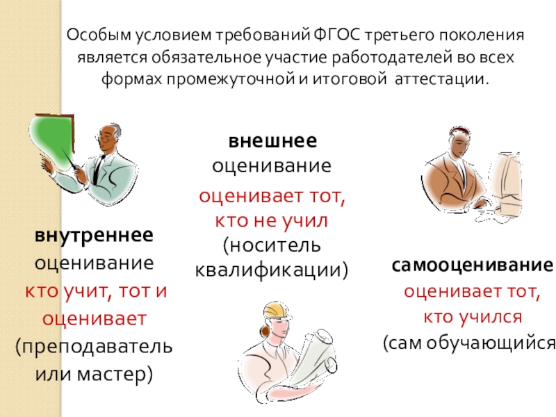 Особым условием требований ФГОС третьего поколения является обязательное участие работодателей во всех формах промежуточной и итоговой аттестации.