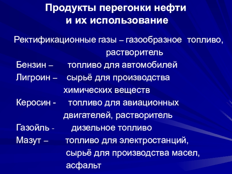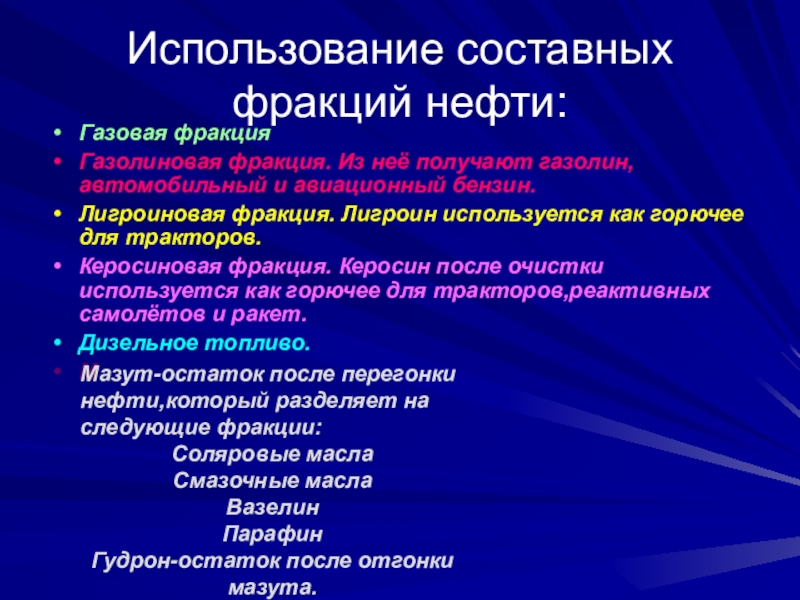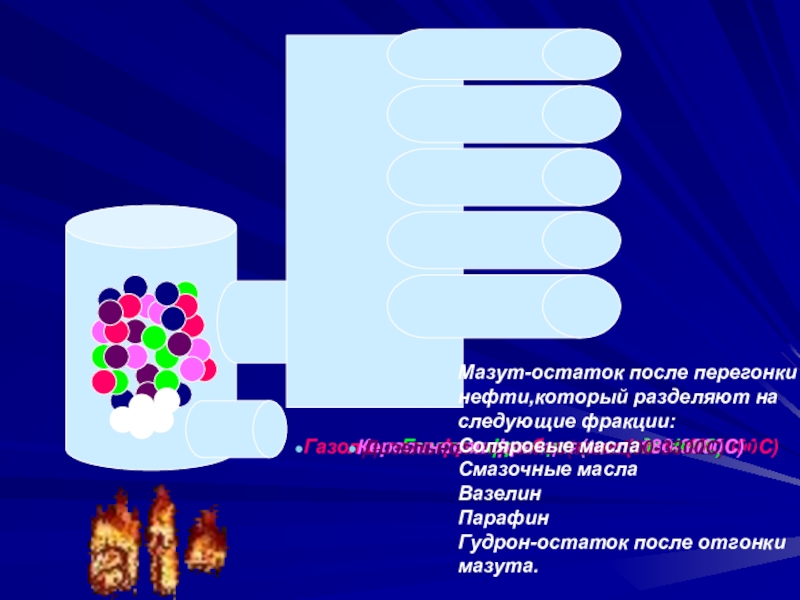 Мазут-остаток после перегонки нефти,который разделяет на следующие фракции: