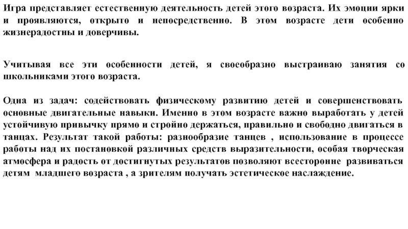 Поэтому , при выборе танцевального репертуара я учитываю интересы и склонности детей данного возраста. Танец не должен выглядеть фальшиво.