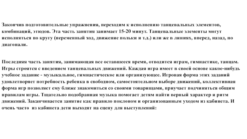 Слайд 9Закончив подготовительные упражнения, переходим к исполнению танцевальных элементов, комбинаций, этюдов. Эта