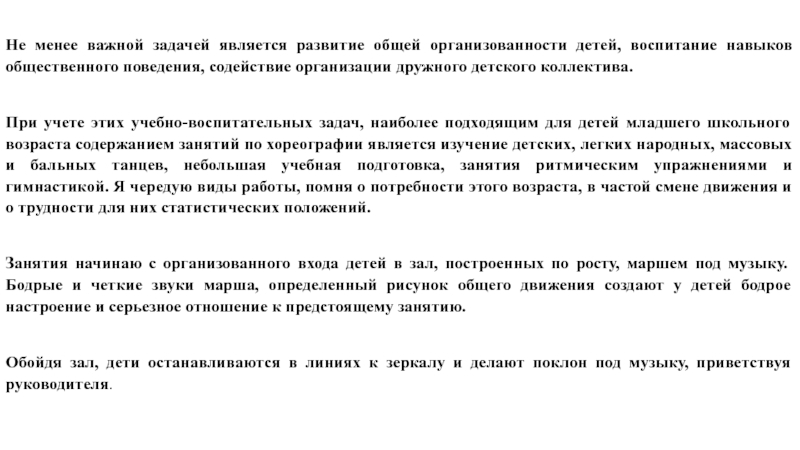 В процессе работы с детьми я стараюсь объяснять ребятам значение каждого движения, способ его исполнения. Учащийся должен знать, что исполнение тех или иных движений не просто "прихоть« педагога, а целенаправленное выполнение задач учебно-тренировочной работы. Я объясняю им, что в искусстве танца нет "потолка", что каждое танцевальное движение, фрагмент могут отрабатываться и совершенствоваться до бесконечности.