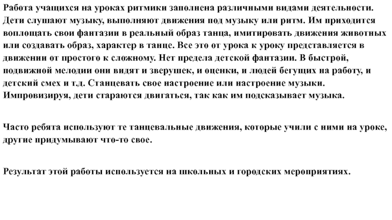 Слайд 17Работа учащихся на уроках ритмики заполнена различными видами деятельности. Дети слушают
