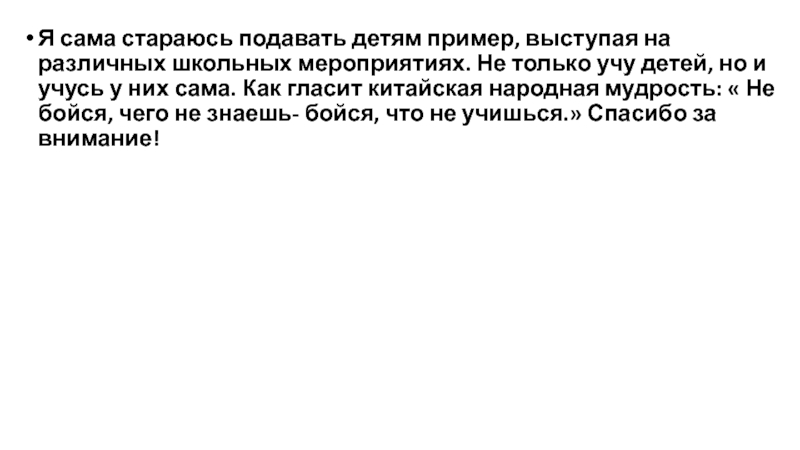 Не только учу детей, но и учусь у них сама. Как гласит китайская народная мудрость: « Не бойся, чего не знаешь- бойся, что не учишься.» Спасибо за внимание!