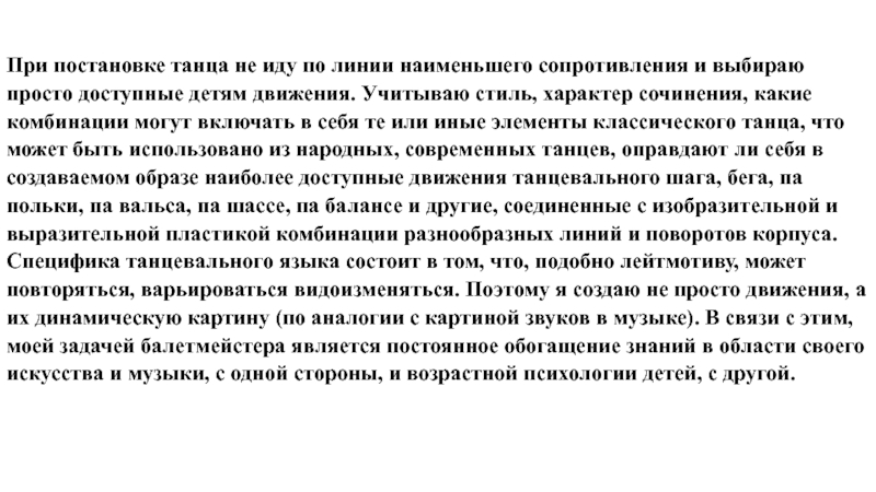 просто доступные детям движения. Учитываю стиль, характер сочинения, какие комбинации могут включать в себя те или иные элементы классического танца, что может быть использовано из народных, современных танцев, оправдают ли себя в создаваемом образе наиболее доступные движения танцевального шага, бега, па польки, па вальса, па шассе, па балансе и другие, соединенные с изобразительной и выразительной пластикой комбинации разнообразных линий и поворотов корпуса. Специфика танцевального языка состоит в том, что, подобно лейтмотиву, может повторяться, варьироваться видоизменяться. Поэтому я создаю не просто движения, а их динамическую картину (по аналогии с картиной звуков в музыке). В связи с этим, моей задачей балетмейстера является постоянное обогащение знаний в области своего искусства и музыки, с одной стороны, и возрастной психологии детей, с другой.