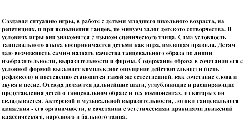 репетициях, и при исполнении танцев, не минуем залог детского сотворчества. В условиях игры они знакомятся с языком сценического танца. Сама условность танцевального языка воспринимается детьми как игра, имеющая правила. Детям даю возможность самим назвать качества танцевального образа по линии изобразительности, выразительности и формы. Содержание образа в сочетании его с условной формой вызывает комплексное ощущение действительности (цепь рефлексов) и постепенно становится такой же естественной, как сочетание слова и звука в песне. Отсюда делаются дальнейшие шаги, углубляющие и расширяющие представления детей о танцевальном образе и тех компонентах, из которых он складывается. Актерской и музыкальной выразительности, логики танцевального движения - его органичности, в сочетании с эстетическими правилами движений классического, народного и бального танца.