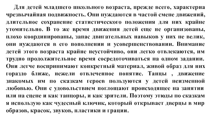 нуждаются в частой смене движений, длительное сохранение статистического положения для них крайне утомительно. В то же время движения детей еще не организованы, плохо координированы, запас двигательных навыков у них не велик, они нуждаются в его пополнении и усовершенствовании. Внимание детей этого возраста крайне неустойчиво, они легко отвлекаются, им трудно продолжительное время сосредоточиваться на одном задании. Они легче воспринимают конкретный материал, живой образ для них гораздо ближе, нежели отвлеченное понятие. Танцы , движение знакомых им по сказкам героев пользуются у детей неизменной любовью. Они с удовольствием поглощают происходящее на занятии или на сцене и как танцоры, и как зрители. Поэтому этюды по сказкам я использую как чудесный ключик, который открывает дверцы в мир образов, красок, звуков, пластики и грации.