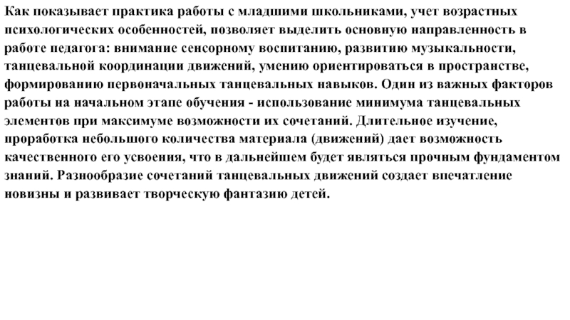 позволяет выделить основную направленность в работе педагога: внимание сенсорному воспитанию, развитию музыкальности, танцевальной координации движений, умению ориентироваться в пространстве, формированию первоначальных танцевальных навыков. Один из важных факторов работы на начальном этапе обучения - использование минимума танцевальных элементов при максимуме возможности их сочетаний. Длительное изучение, проработка небольшого количества материала (движений) дает возможность качественного его усвоения, что в дальнейшем будет являться прочным фундаментом знаний. Разнообразие сочетаний танцевальных движений создает впечатление новизны и развивает творческую фантазию детей.