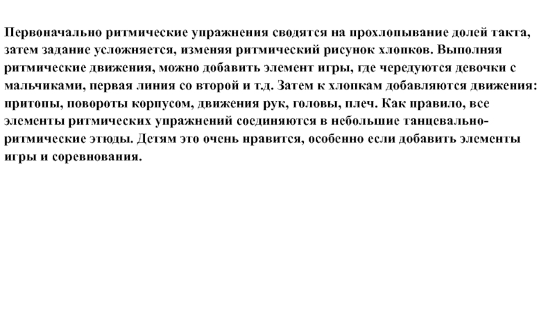 изменяя ритмический рисунок хлопков. Выполняя ритмические движения, можно добавить элемент игры, где чередуются девочки с мальчиками, первая линия со второй и т.д. Затем к хлопкам добавляются движения: притопы, повороты корпусом, движения рук, головы, плеч. Как правило, все элементы ритмических упражнений соединяются в небольшие танцевально-ритмические этюды. Детям это очень нравится, особенно если добавить элементы игры и соревнования.