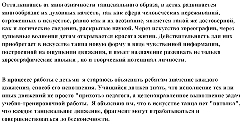 Слайд 14Отталкиваясь от многозначности танцевального образа, в детях развивается многообразие их духовных