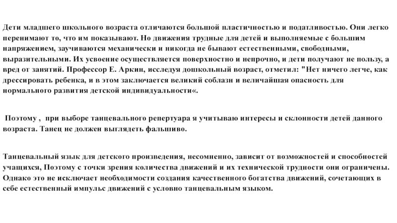 перенимают то, что им показывают. Но движения трудные для детей и выполняемые с большим напряжением, заучиваются механически и никогда не бывают естественными, свободными, выразительными. Их усвоение осуществляется поверхностно и непрочно, и дети получают не пользу, а вред от занятий. Профессор Е. Аркин, исследуя дошкольный возраст, отметил: "Нет ничего легче, как дрессировать ребенка, и в этом заключается великий соблазн и величайшая опасность для нормального развития детской индивидуальности«.