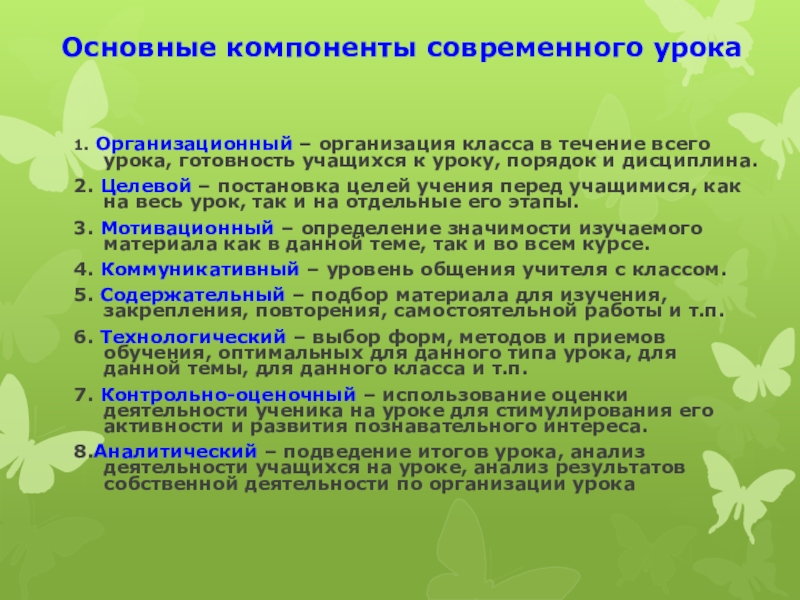 6. Технологический – выбор форм, методов и приемов обучения, оптимальных для данного типа урока, для данной темы, для данного класса и т.п.