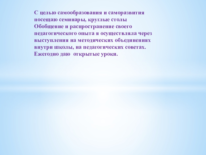 Слайд 18С целью самообразования и саморазвития посещаю семинары, круглые столы Обобщение и
