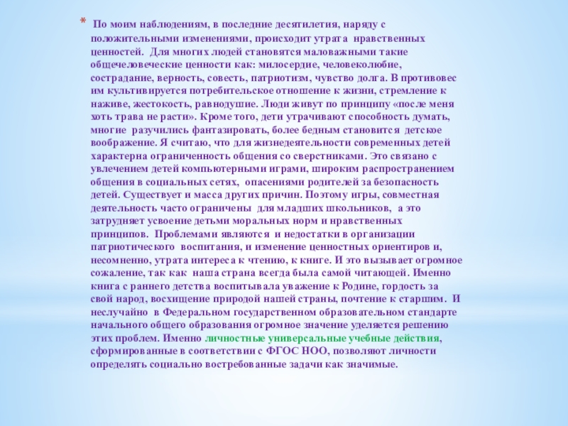 происходит утрата нравственных ценностей. Для многих людей становятся маловажными такие общечеловеческие ценности как: милосердие, человеколюбие, сострадание, верность, совесть, патриотизм, чувство долга. В противовес им культивируется потребительское отношение к жизни, стремление к наживе, жестокость, равнодушие. Люди живут по принципу «после меня хоть трава не расти». Кроме того, дети утрачивают способность думать, многие разучились фантазировать, более бедным становится детское воображение. Я считаю, что для жизнедеятельности современных детей характерна ограниченность общения со сверстниками. Это связано с увлечением детей компьютерными играми, широким распространением общения в социальных сетях, опасениями родителей за безопасность детей. Существует и масса других причин. Поэтому игры, совместная деятельность часто ограничены для младших школьников, а это затрудняет усвоение детьми моральных норм и нравственных принципов. Проблемами являются и недостатки в организации патриотического воспитания, и изменение ценностных ориентиров и, несомненно, утрата интереса к чтению, к книге. И это вызывает огромное сожаление, так как наша страна всегда была самой читающей. Именно книга с раннего детства воспитывала уважение к Родине, гордость за свой народ, восхищение природой нашей страны, почтение к старшим. И неслучайно в Федеральном государственном образовательном стандарте начального общего образования огромное значение уделяется решению этих проблем. Именно личностные универсальные учебные действия, сформированные в соответствии с ФГОС НОО, позволяют личности определять социально востребованные задачи как значимые.