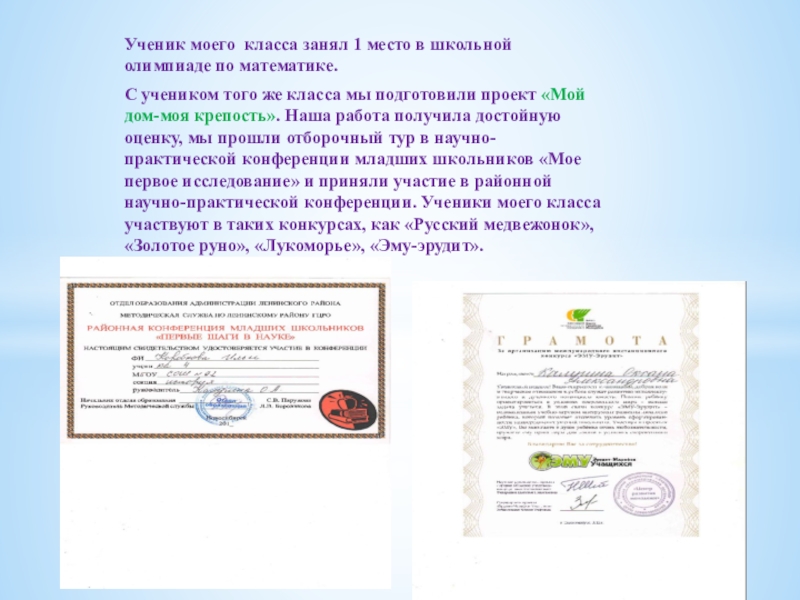 учеником того же класса мы подготовили проект «Мой дом-моя крепость». Наша работа получила достойную оценку, мы прошли отборочный тур в научно-практической конференции младших школьников «Мое первое исследование» и приняли участие в районной научно-практической конференции. Ученики моего класса участвуют в таких конкурсах, как «Русский медвежонок», «Золотое руно», «Лукоморье», «Эму-эрудит».