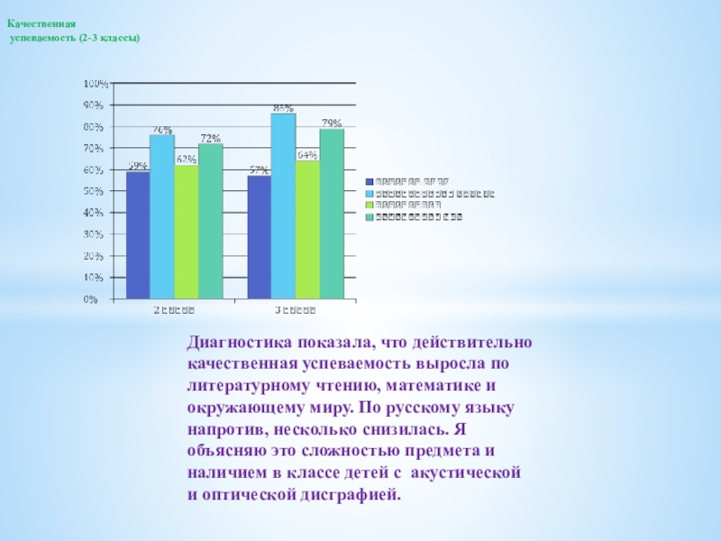 литературному чтению, математике и окружающему миру. По русскому языку напротив, несколько снизилась. Я объясняю это сложностью предмета и наличием в классе детей с акустической и оптической дисграфией.