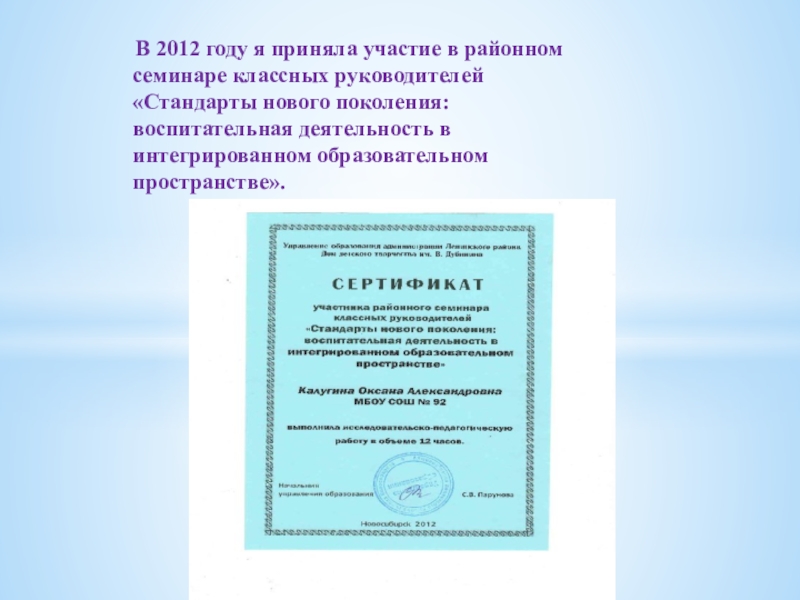 Слайд 19 В 2012 году я приняла участие в районном семинаре классных