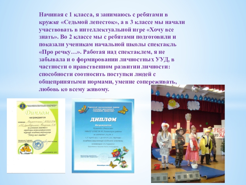 лепесток», а в 3 классе мы начали участвовать в интеллектуальной игре «Хочу все знать». Во 2 классе мы с ребятами подготовили и показали ученикам начальной школы спектакль «Про речку…». Работая над спектаклем, я не забывала и о формировании личностных УУД, в частности о нравственном развитии личности: способности соотносить поступки людей с общепринятыми нормами, умение сопереживать, любовь ко всему живому.