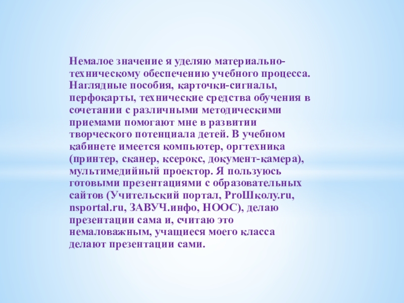 перфокарты, технические средства обучения в сочетании с различными методическими приемами помогают мне в развитии творческого потенциала детей. В учебном кабинете имеется компьютер, оргтехника (принтер, сканер, ксерокс, документ-камера), мультимедийный проектор. Я пользуюсь готовыми презентациями с образовательных сайтов (Учительский портал, ProШколу.ru, nsportal.ru, ЗАВУЧ.инфо, НООС), делаю презентации сама и, считаю это немаловажным, учащиеся моего класса делают презентации сами.