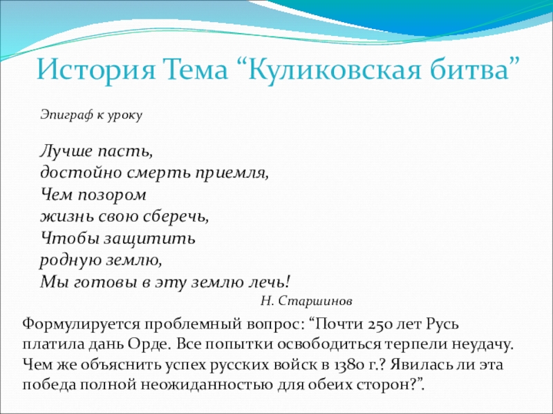Формулируется проблемный вопрос: “Почти 250 лет Русь платила дань Орде. Все попытки освободиться терпели неудачу. Чем же объяснить успех русских войск в 1380 г.? Явилась ли эта победа полной неожиданностью для обеих сторон?”.