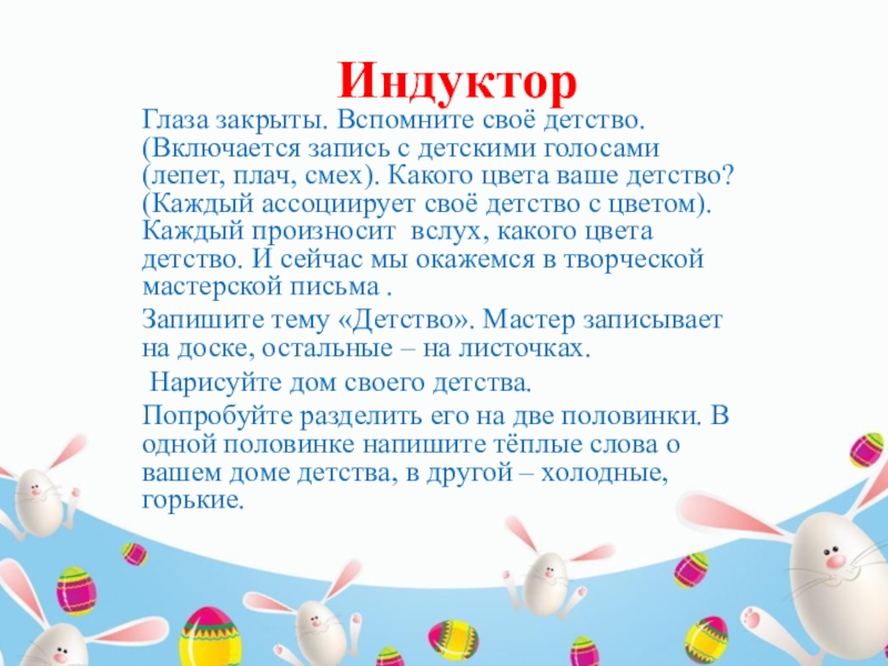 Запишите тему «Детство». Мастер записывает на доске, остальные – на листочках.