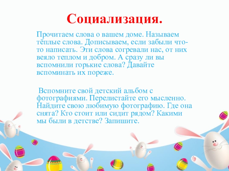 Вспомните свой детский альбом с фотографиями. Перелистайте его мысленно. Найдите свою любимую фотографию. Где она снята? Кто стоит или сидит рядом? Какими мы были в детстве? Запишите.
