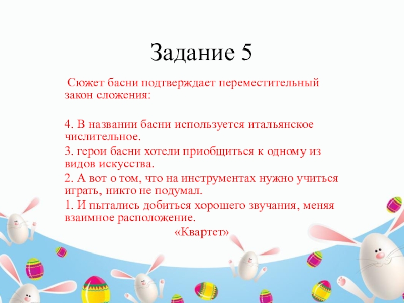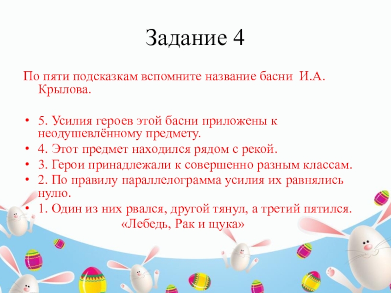 По пяти подсказкам вспомните название басни И.А.Крылова.