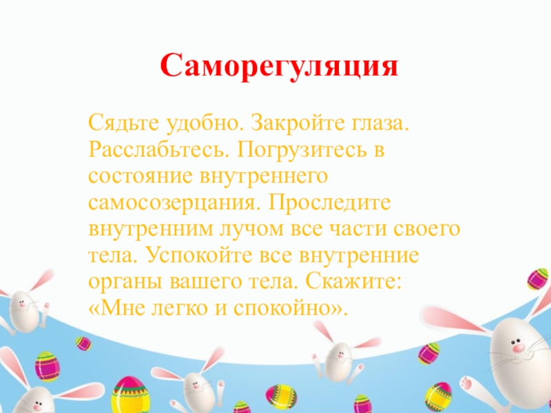 Сядьте удобно. Закройте глаза. Расслабьтесь. Погрузитесь в состояние внутреннего самосозерцания. Проследите