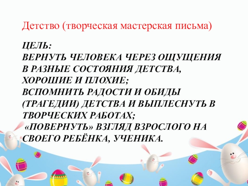вспомнить радости и обиды (трагедии) детства и выплеснуть в творческих работах;