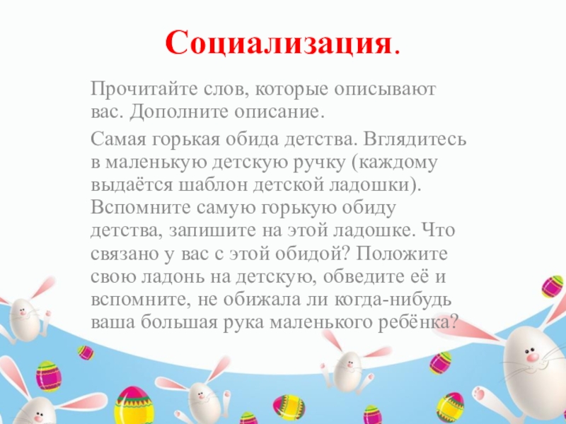 в маленькую детскую ручку (каждому выдаётся шаблон детской ладошки). Вспомните самую горькую обиду детства, запишите на этой ладошке. Что связано у вас с этой обидой? Положите свою ладонь на детскую, обведите её и вспомните, не обижала ли когда-нибудь ваша большая рука маленького ребёнка?