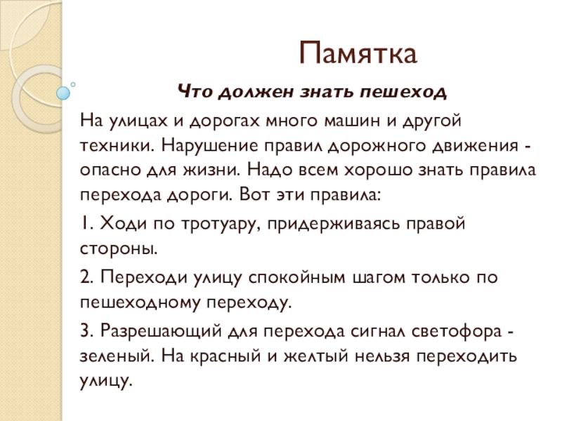 На улицах и дорогах много машин и другой техники. Нарушение правил дорожного движения - опасно для жизни. Надо всем хорошо знать правила перехода дороги. Вот эти правила: