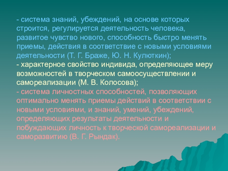 - система личностных способностей, позволяющих оптимально менять приемы действий в соответствии с новыми условиями, и знаний, умений, убеждений, определяющих результаты деятельности и побуждающих личность к творческой самореализации и саморазвитию (В. Г. Рындак).