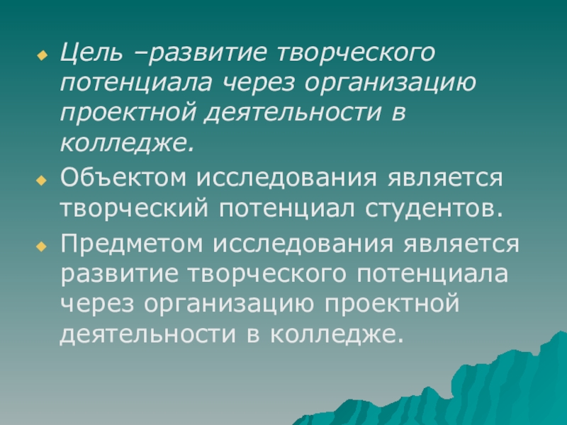 Предметом исследования является развитие творческого потенциала через организацию проектной деятельности в колледже.