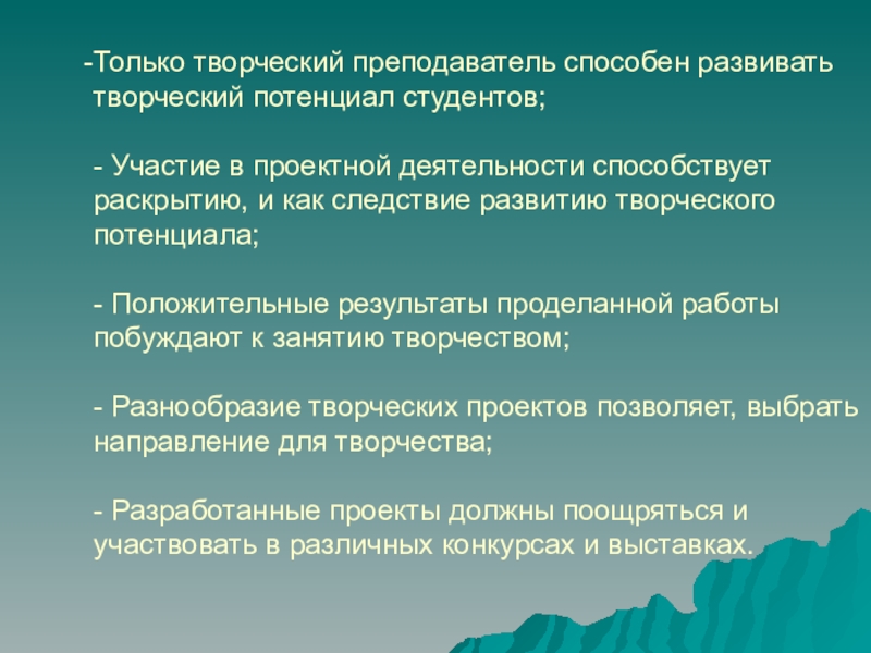 Слайд 12Только творческий преподаватель способен развивать творческий потенциал студентов;