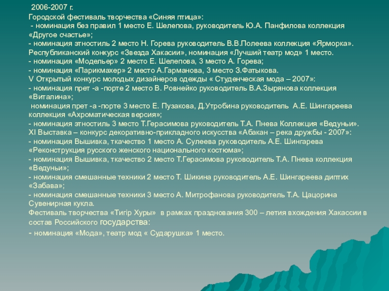 - номинация этностиль 3 место Т.Герасимова руководитель Т.А. Пнева Коллекция «Ведуньи».