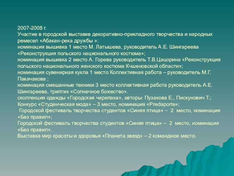 - номинация Вышивка, ткачество 1 место А. Сулеева руководитель А.Е. Шингарева «Реконструкция русского женского национального костюма»;