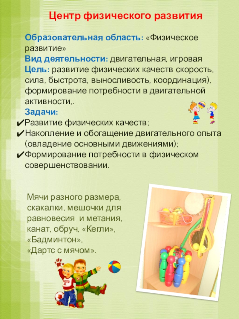 физических качеств скорость, сила, быстрота, выносливость, координация), формирование потребности в двигательной активности,.