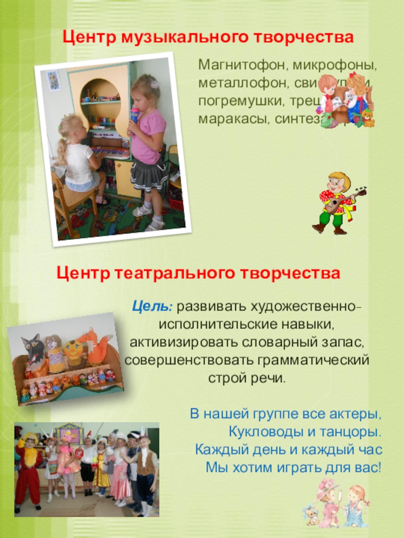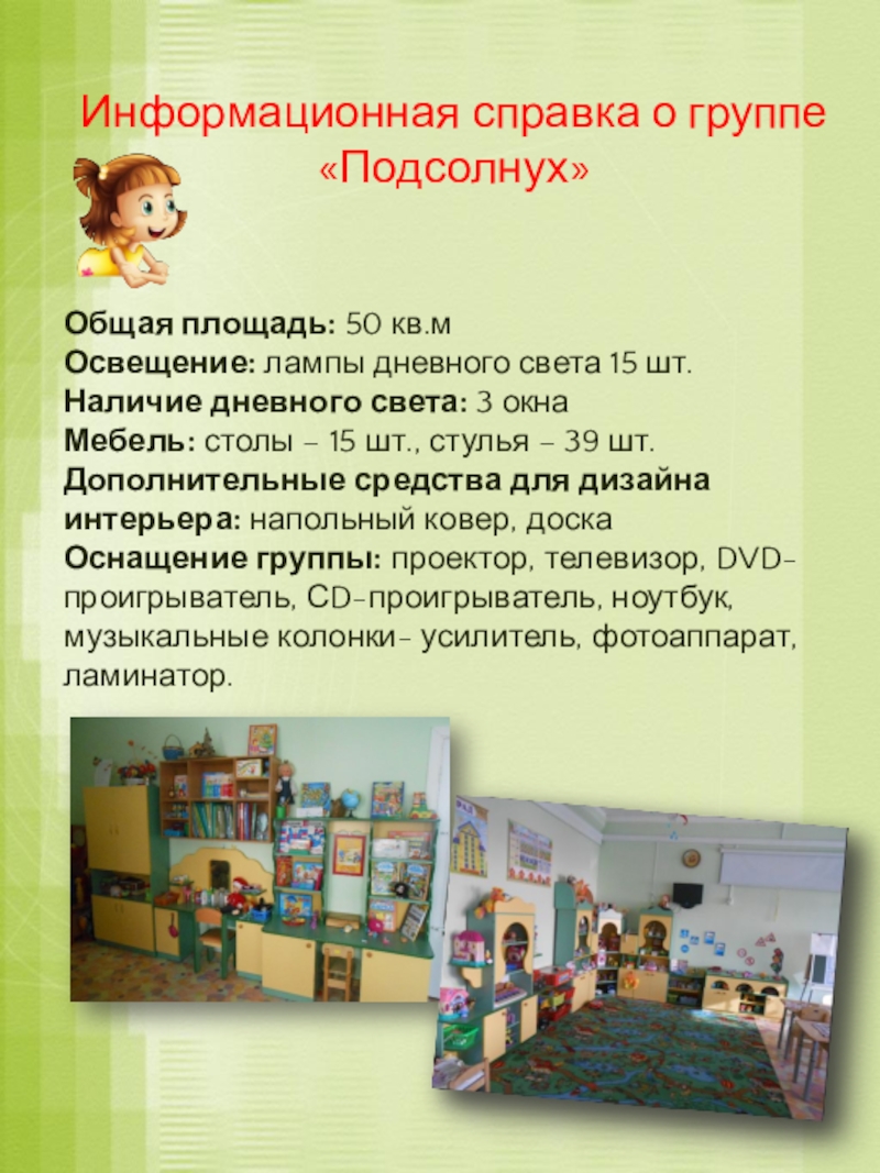 Оснащение группы: проектор, телевизор, DVD-проигрыватель, СD-проигрыватель, ноутбук, музыкальные колонки- усилитель, фотоаппарат, ламинатор.