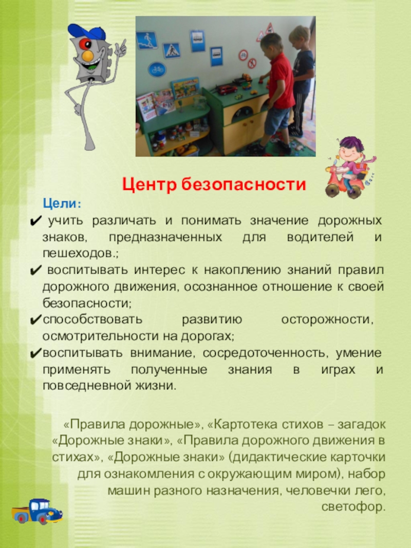 «Правила дорожные», «Картотека стихов – загадок «Дорожные знаки», «Правила дорожного движения в стихах», «Дорожные знаки» (дидактические карточки для ознакомления с окружающим миром), набор машин разного назначения, человечки лего, светофор.