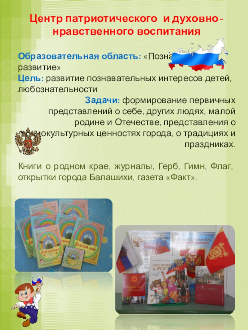 Задачи: формирование первичных представлений о себе, других людях, малой родине и Отечестве, представления о социокультурных ценностях города, о традициях и праздниках.
