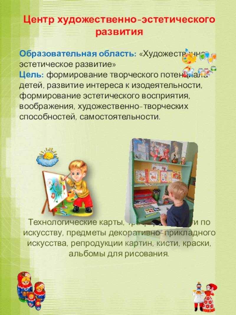 Технологические карты, трафареты, книги по искусству, предметы декоративно-прикладного искусства, репродукции картин, кисти, краски, альбомы для рисования.
