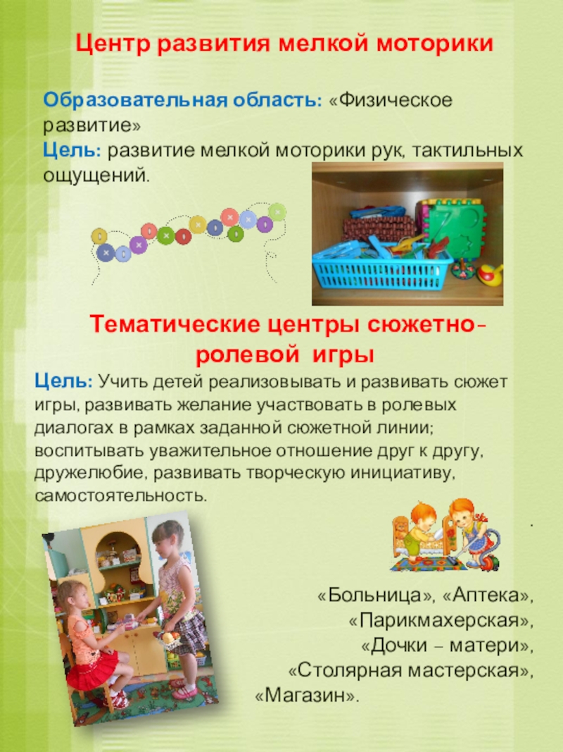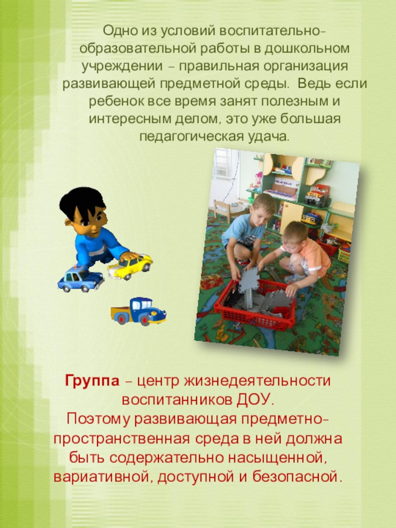 развивающей предметной среды. Ведь если ребенок все время занят полезным и интересным делом, это уже большая педагогическая удача.