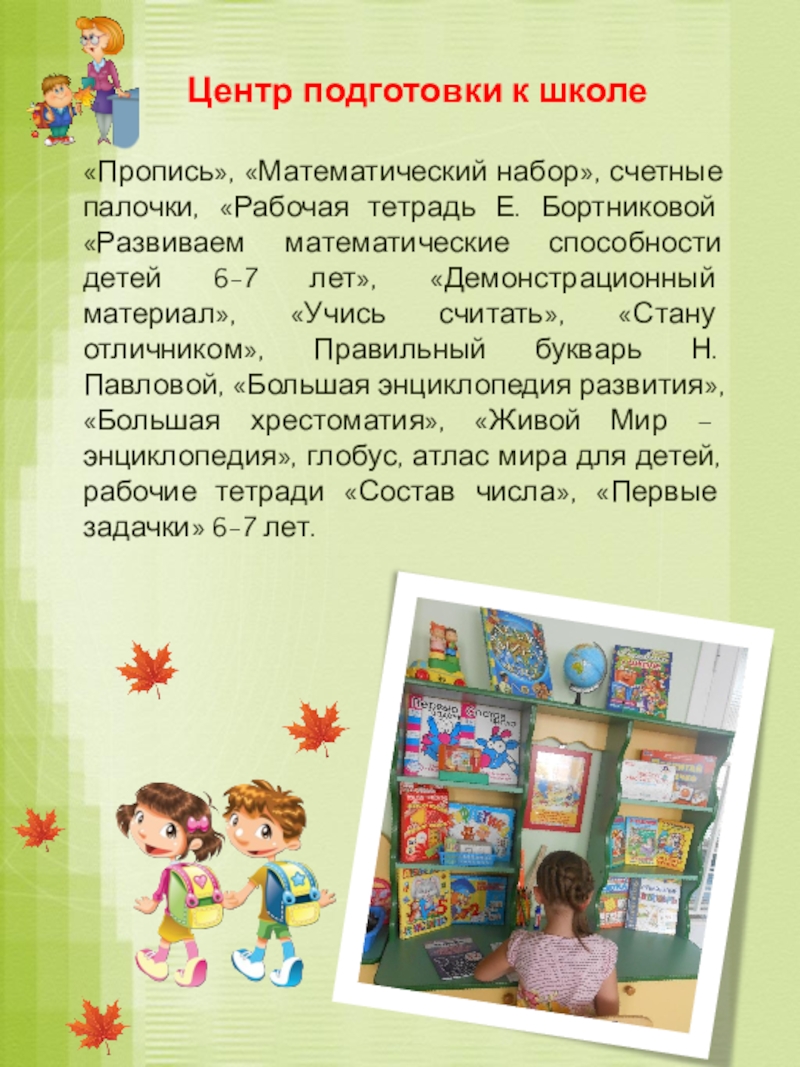 тетрадь Е. Бортниковой «Развиваем математические способности детей 6-7 лет», «Демонстрационный материал», «Учись считать», «Стану отличником», Правильный букварь Н. Павловой, «Большая энциклопедия развития», «Большая хрестоматия», «Живой Мир – энциклопедия», глобус, атлас мира для детей, рабочие тетради «Состав числа», «Первые задачки» 6-7 лет.