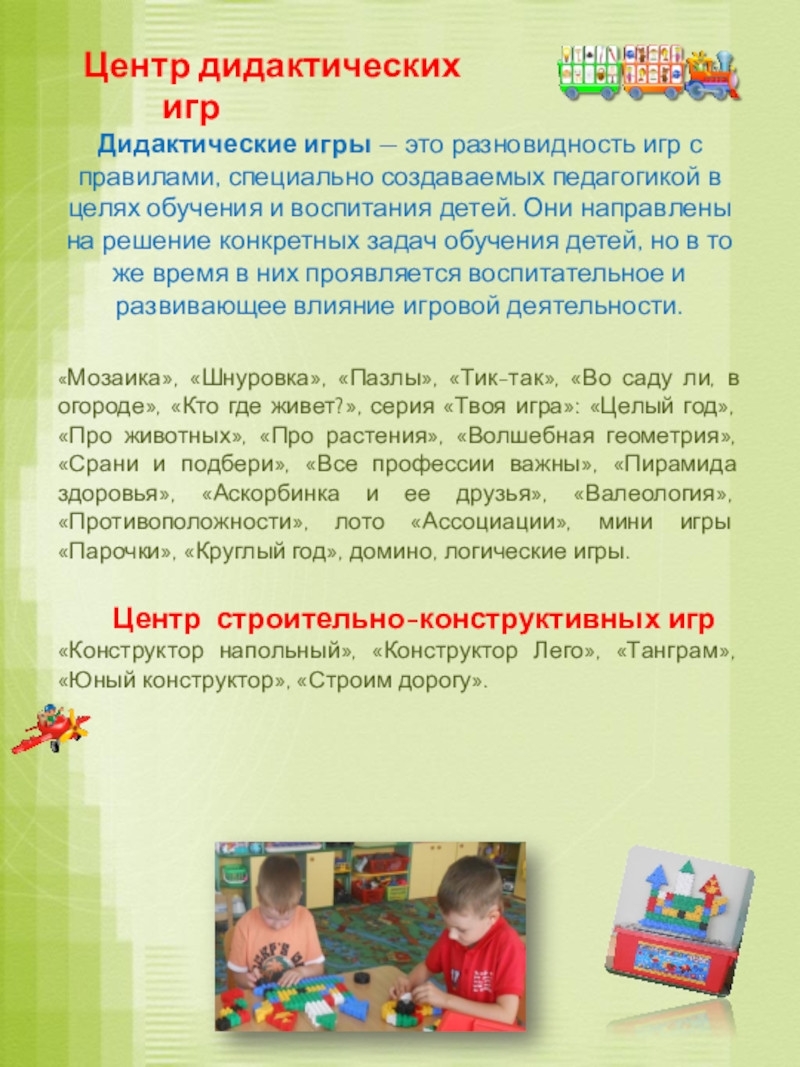 «Мозаика», «Шнуровка», «Пазлы», «Тик-так», «Во саду ли, в огороде», «Кто где живет?», серия «Твоя игра»: «Целый год», «Про животных», «Про растения», «Волшебная геометрия», «Срани и подбери», «Все профессии важны», «Пирамида здоровья», «Аскорбинка и ее друзья», «Валеология», «Противоположности», лото «Ассоциации», мини игры «Парочки», «Круглый год», домино, логические игры.