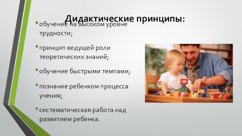 Дидактические принципы:обучение на высоком уровне трудности;принцип ведущей роли теоретических знаний;обучение быстрыми темпами;познание ребенком процесса учения;систематическая работа над