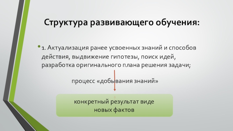 Структура развивающего обучения:1. Актуализация ранее усвоенных знаний и способов действия, выдвижение гипотезы, поиск идей, разработка оригинального плана
