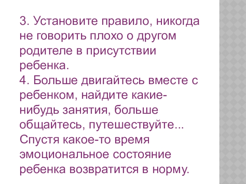 Слайд 233. Установите правило, никогда не говорить плохо о другом родителе в