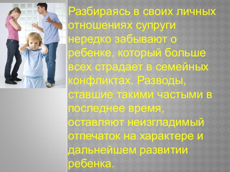 Слайд 5Разбираясь в своих личных отношениях супруги нередко забывают о ребенке, который
