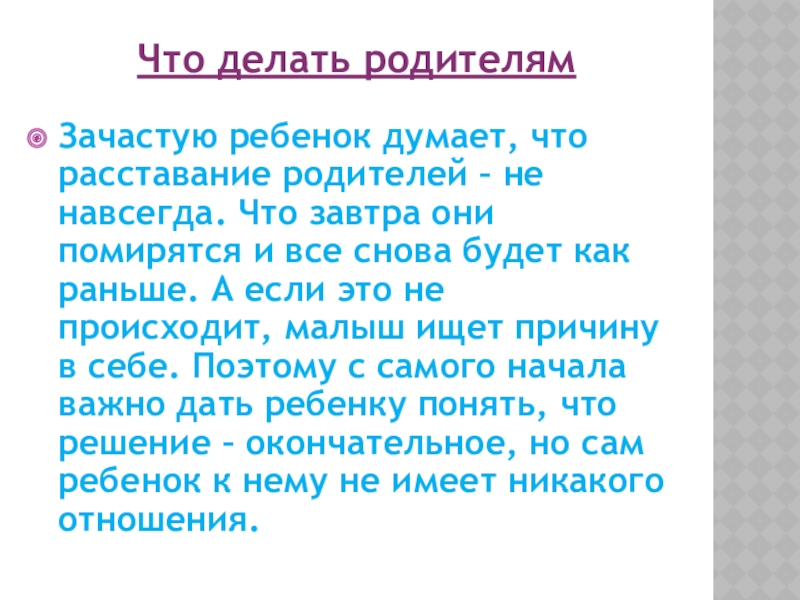 Что завтра они помирятся и все снова будет как раньше. А если это не происходит, малыш ищет причину в себе. Поэтому с самого начала важно дать ребенку понять, что решение – окончательное, но сам ребенок к нему не имеет никакого отношения.