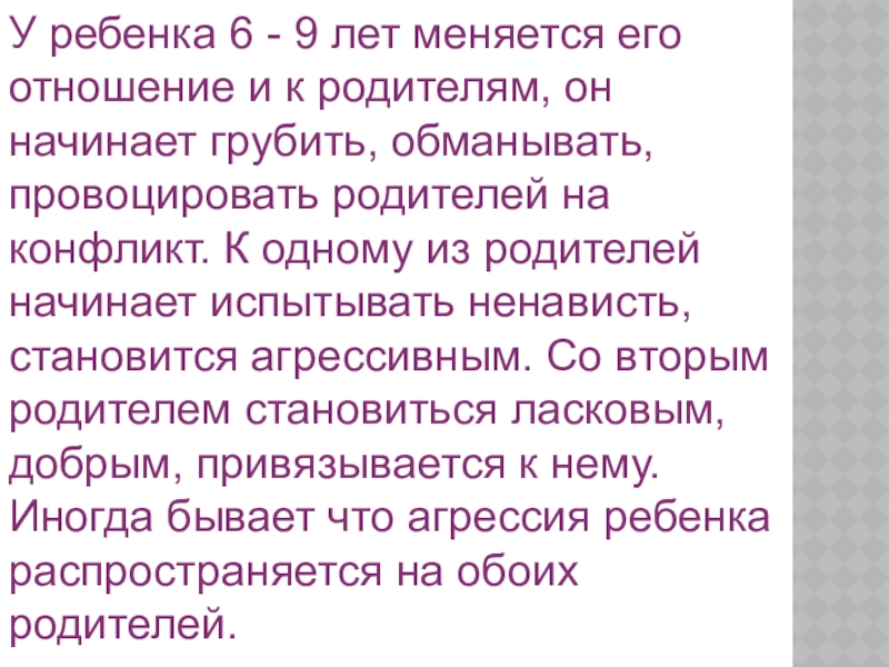 конфликт. К одному из родителей начинает испытывать ненависть, становится агрессивным. Со вторым родителем становиться ласковым, добрым, привязывается к нему.