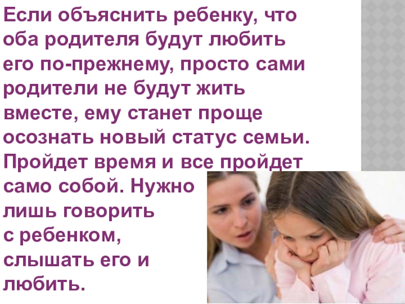 Слайд 19Если объяснить ребенку, что оба родителя будут любить его по-прежнему, просто